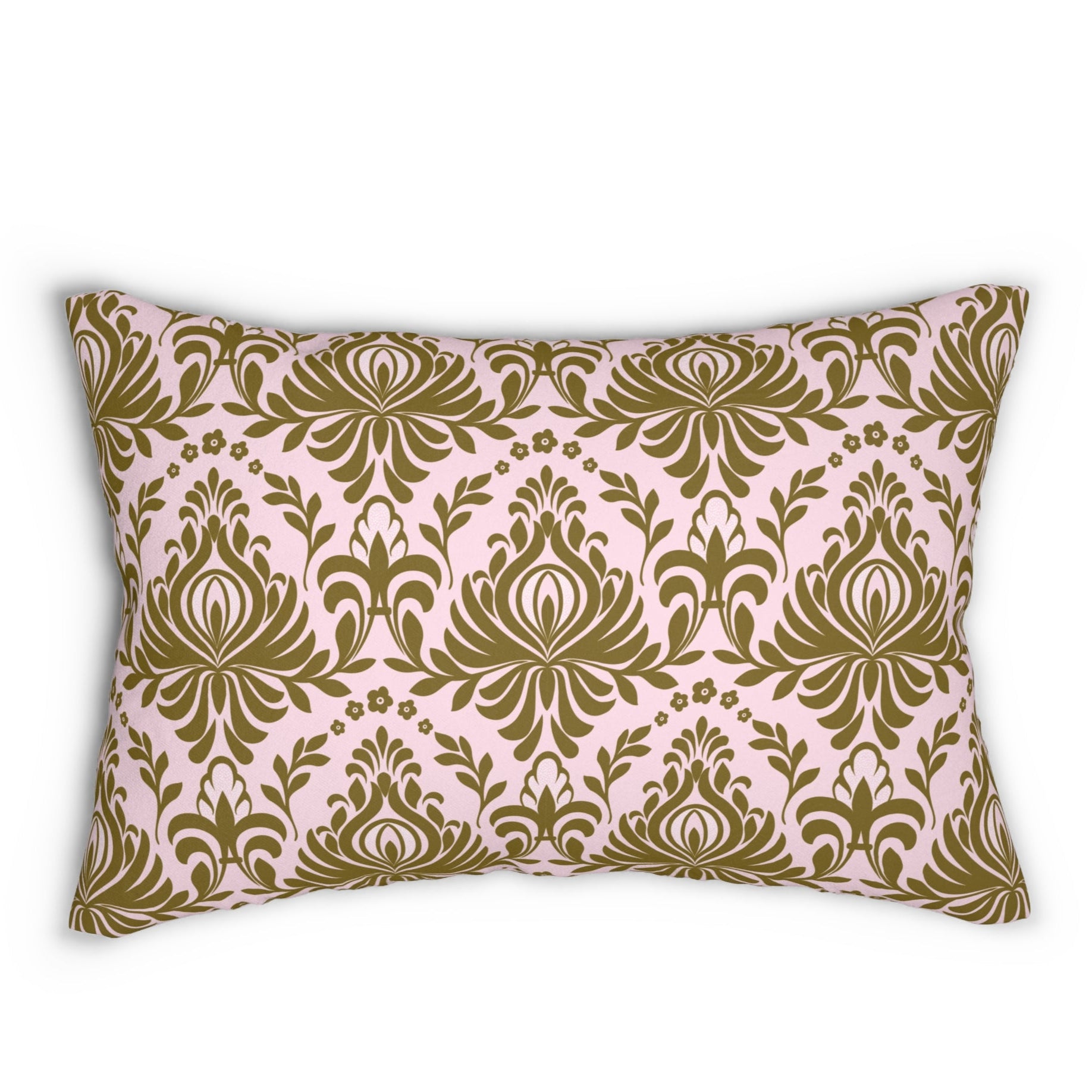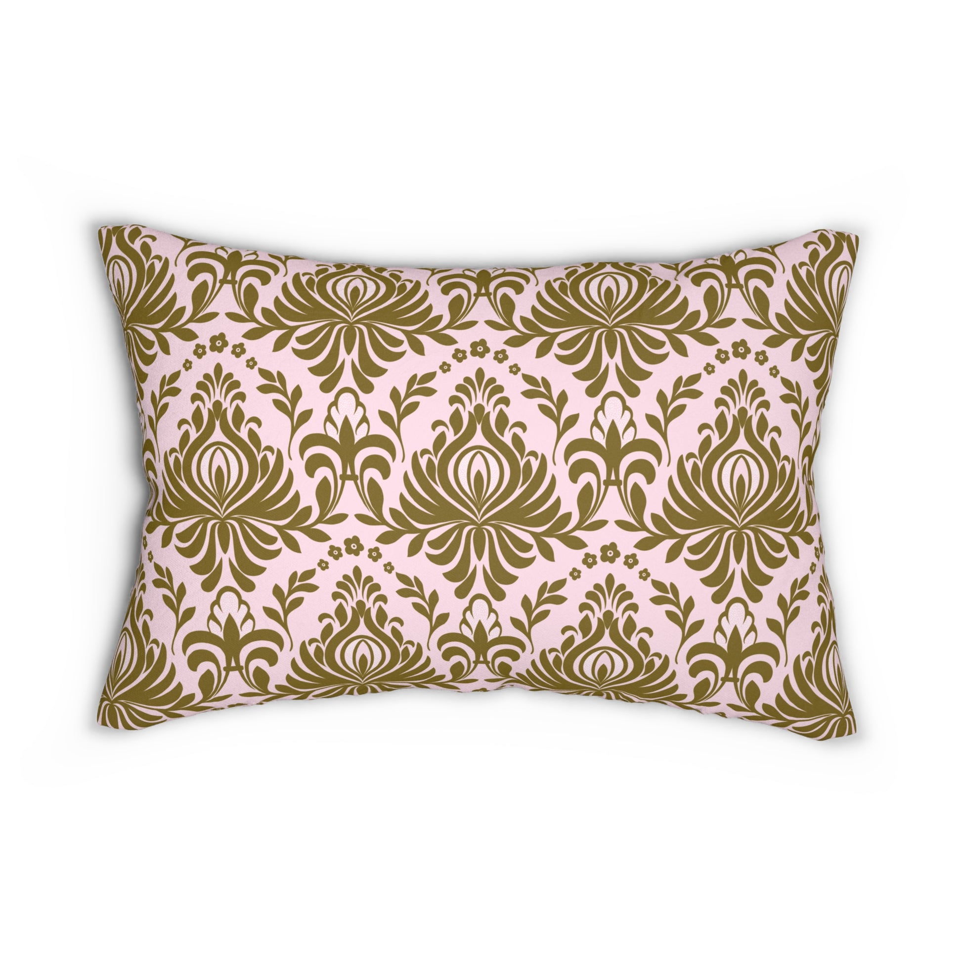 Add a touch of timeless elegance to your home with this 20" x 14" Gilded Pink Lumbar Accent Pillow. Designed with a sophisticated damask pattern in gold over a soft blush pink background, this decorative lumbar pillow offers both style and comfort for any room.