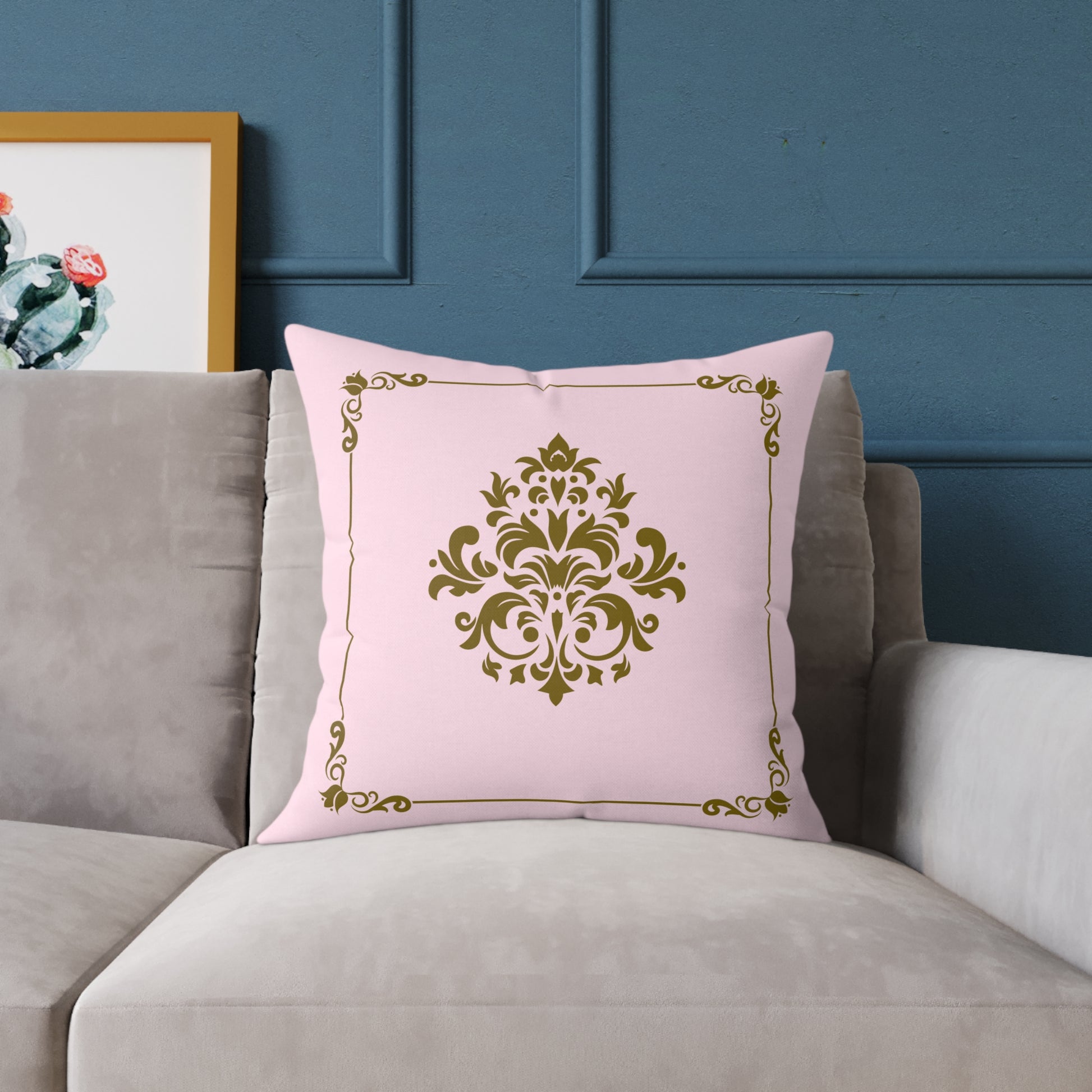 Brighten your home with this Gilded Pink Reversible Decorative Pillow , featuring a two-sided design for versatile styling. One side showcases a classic damask motif, while the other side highlights a gold butterfly, adding a whimsical yet elegant touch to any space.